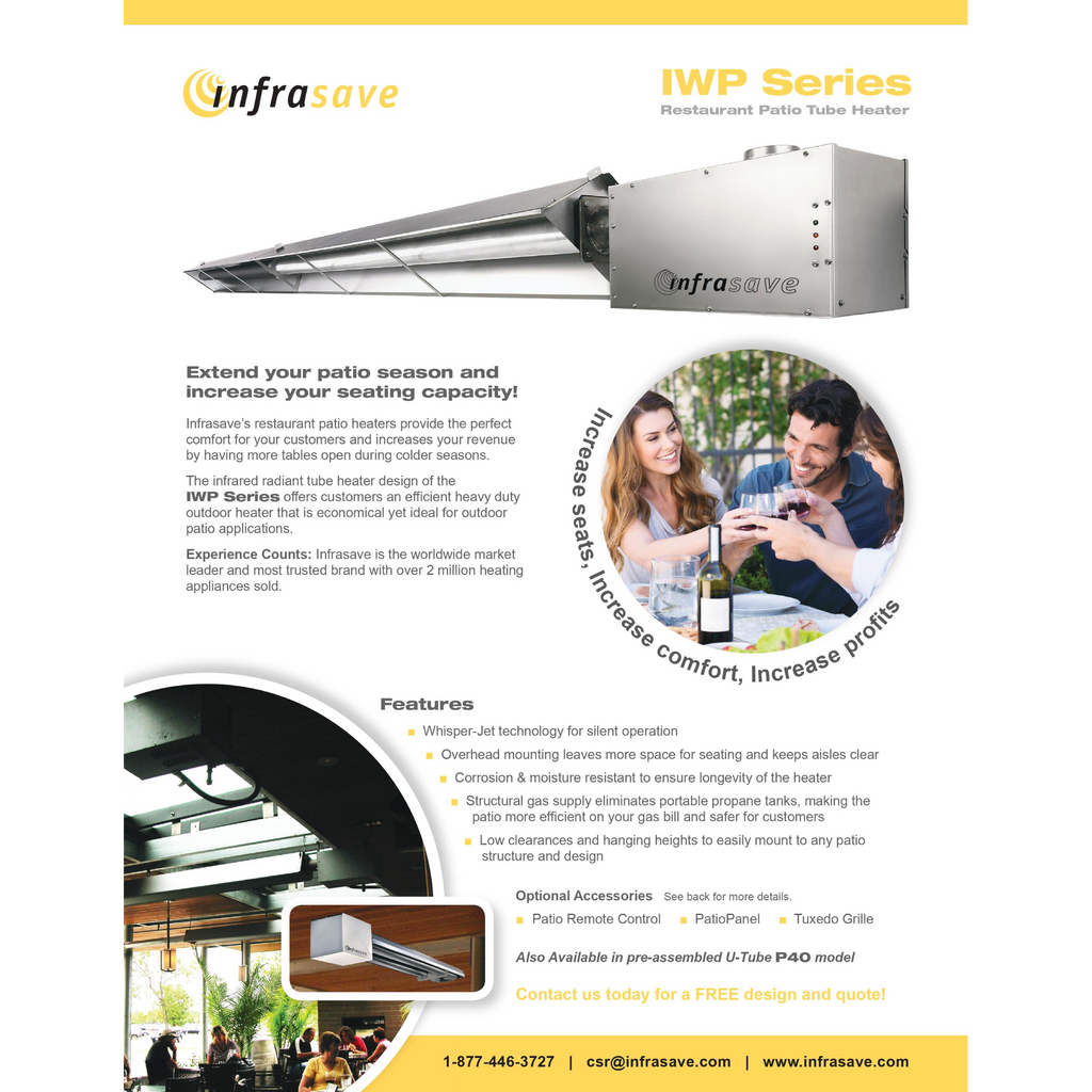 Infrasave is the worldwide market leader and most trusted brand with over 2 million heating appliances sold. If you want to Extend your patio season and increase your seating capacity IW/IWP Series is your best choice.