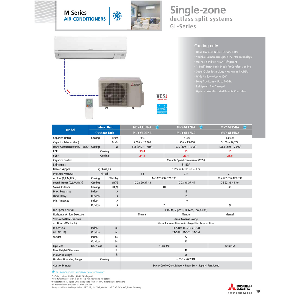 Indoor unit model numbers may be MSY-GL09NA, MSY-GL12NA, MSY-GL15NA, MSY-GL18NA, and MSY-GL24NA Outdoor unit model numbers will be MUY-GL09NA, MUY-GL12NA, MUY-GL15NA, MUY-GL18NA, and MUY-GL24NA for single-zone systems.